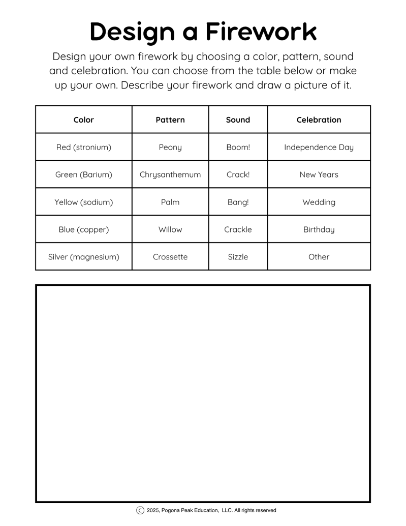 There are so many fun ways to explore fireworks with your kids beyond just watching them. You can challenge them to guess what elements might be making each color they see in the sky. You could talk about sparklers and how the metal burns when it reacts with oxygen, giving off light and heat. Or try a creative art project where your child draws and invents their own firework by choosing colors, shapes, and even the sound it might make. We have a FREE worksheet to design your own firework here.